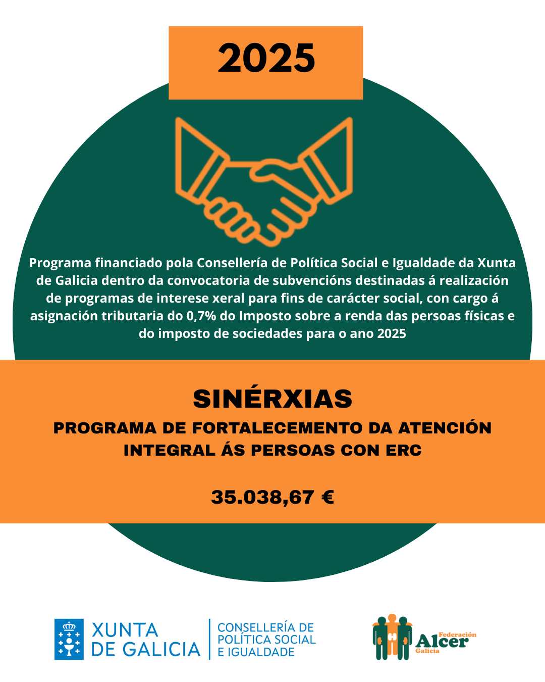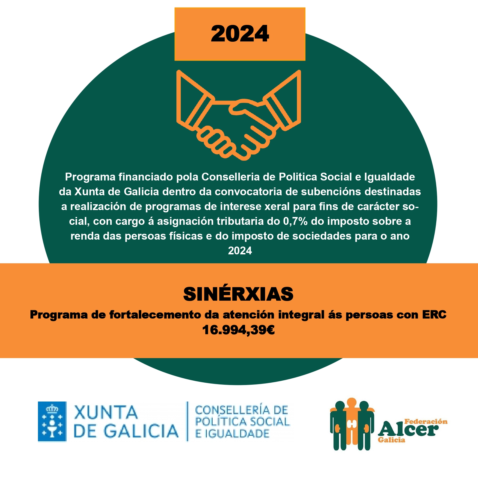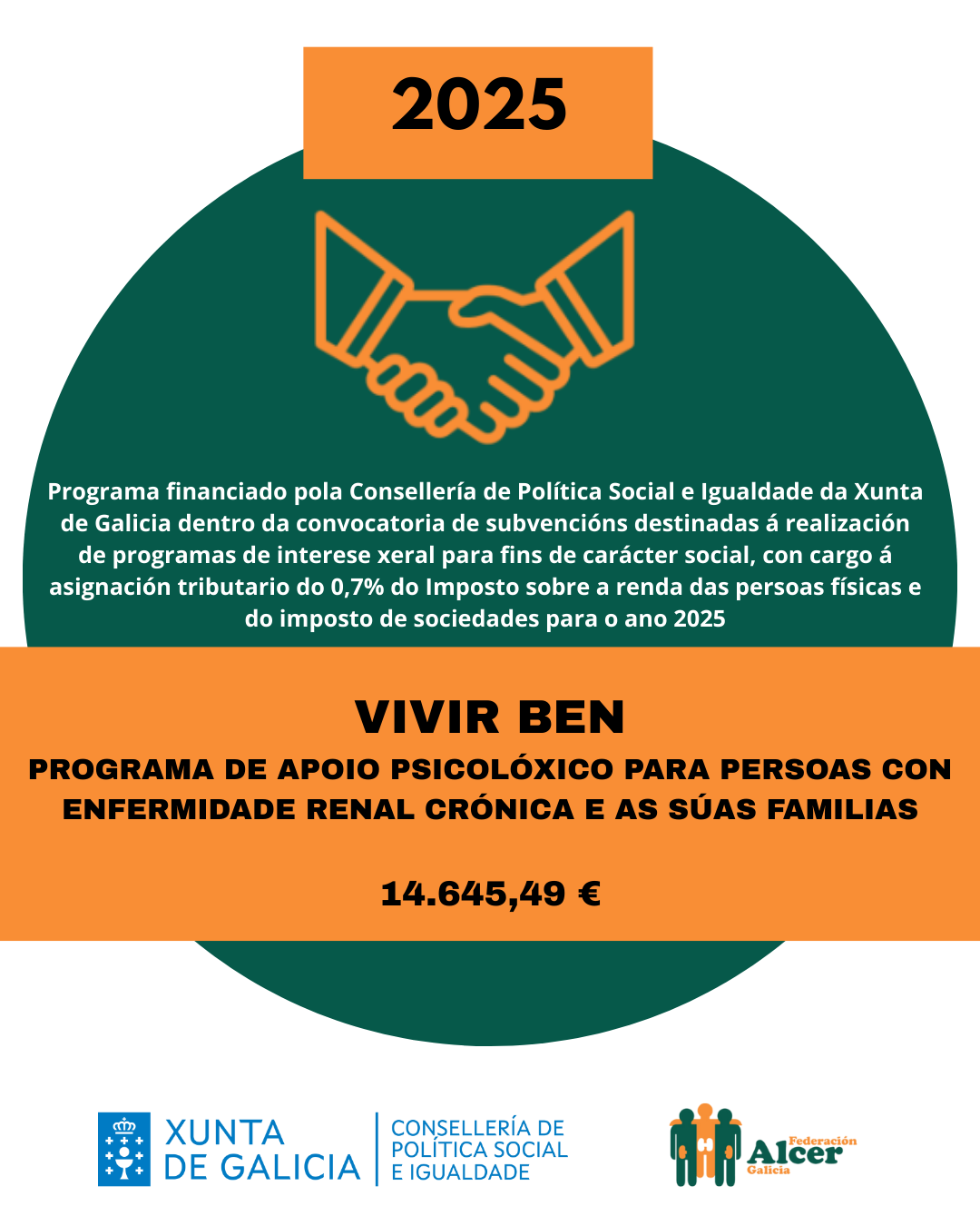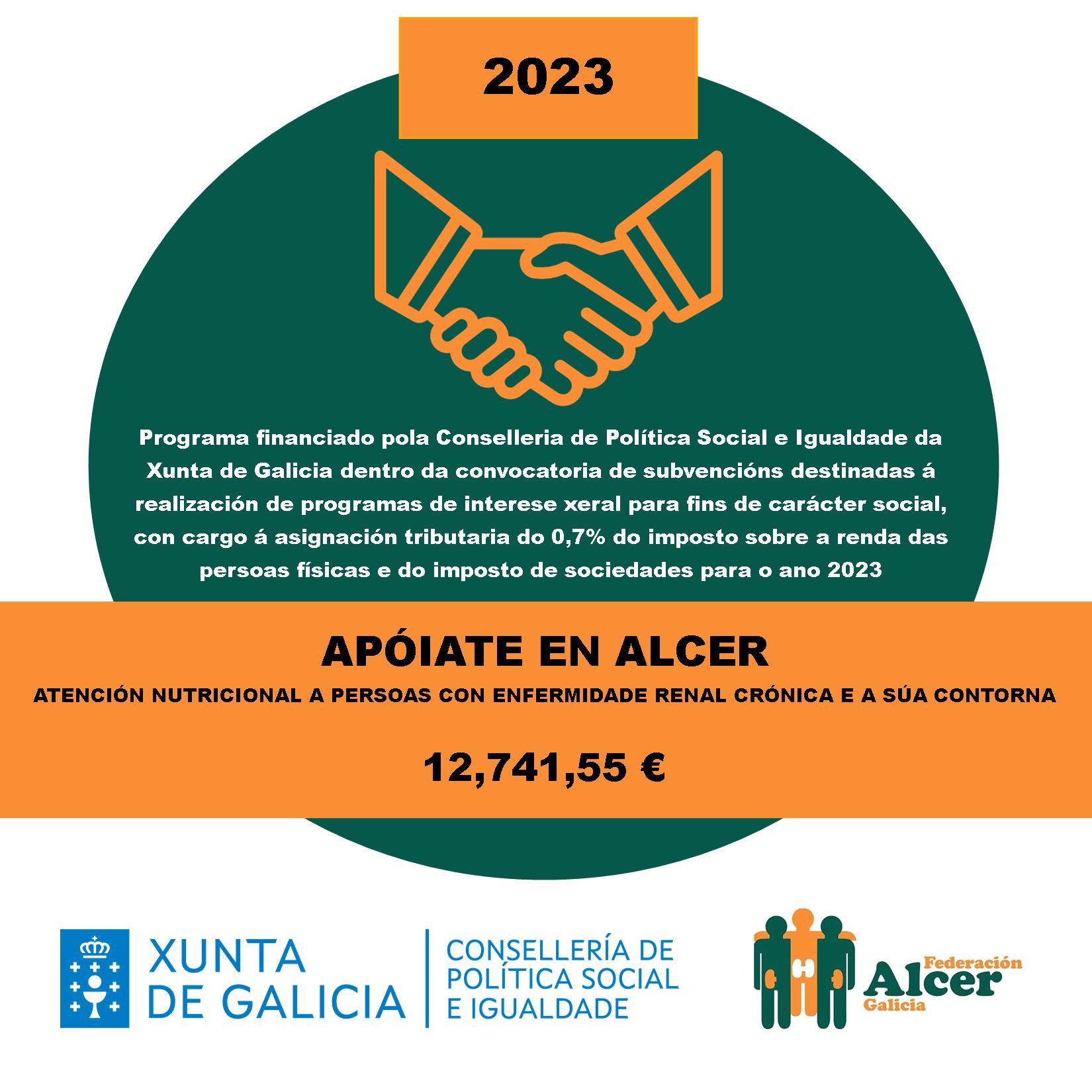 Financiamento do programa <<SINERXIAS>> Financiamento do programa ”Vivir Ben” VII XORNADAS DE PERSOAS CON ENFERMIDADE RENAL DE GALICIA FINANCIAMENTO DA DEPUTACIÓN DE OURENSE FINANCIAMENTO AO PROGRAMA DE VOLUNTARIADO FINANCIAMENTO DO PROGRAMA “VIVIR BEN” FINANCIAMENTO DO PROGRAMA “SINERXIAS” SUBVENCIÓN DA DEPUTACIÓN DA CORUÑA AO PROGRAMA “COME CON ALCER” SUBVENCIÓN AO PROGRAMA “APÓIATE EN ALCER” SUBVENCIÓN DA CONSELLERÍA DE CULTURA, LINGUA E XUVENTUDE DA XUNTA DE GALICIA VIDEO EXPLICATIVO DE NUTRICIÓN EN ERCA VIDEO EXPLICATIVO DE NUTRICIÓN EN DIÁLISE Convenio coa Consellería de Política Social e Igualdade Encontro de persoas con enfermidade renal de Galicia 2024 Cofinanciación cos fondos IRPF do Programa Apóiate en Alcer 2023 Cofinanciación cos fondos IRPF do Programa Sinerxias 2023 Subvención da Deputación da Coruña A sexualidade das persoas con enfermidade renal crónica a debate onte en Lugo Alcer realiza formación en prevención do suicidio entre o seu equipo técnico de Galicia Obradoiro de xestión de estrés e ansiedade en Ourense Curso sobre a Discapacidade e a Dependencia na Enfermidade Renal Encontro entre persoas con enfermidade renal en 📍Panxón, Nigrán. Encontro de familias medro en Panxón